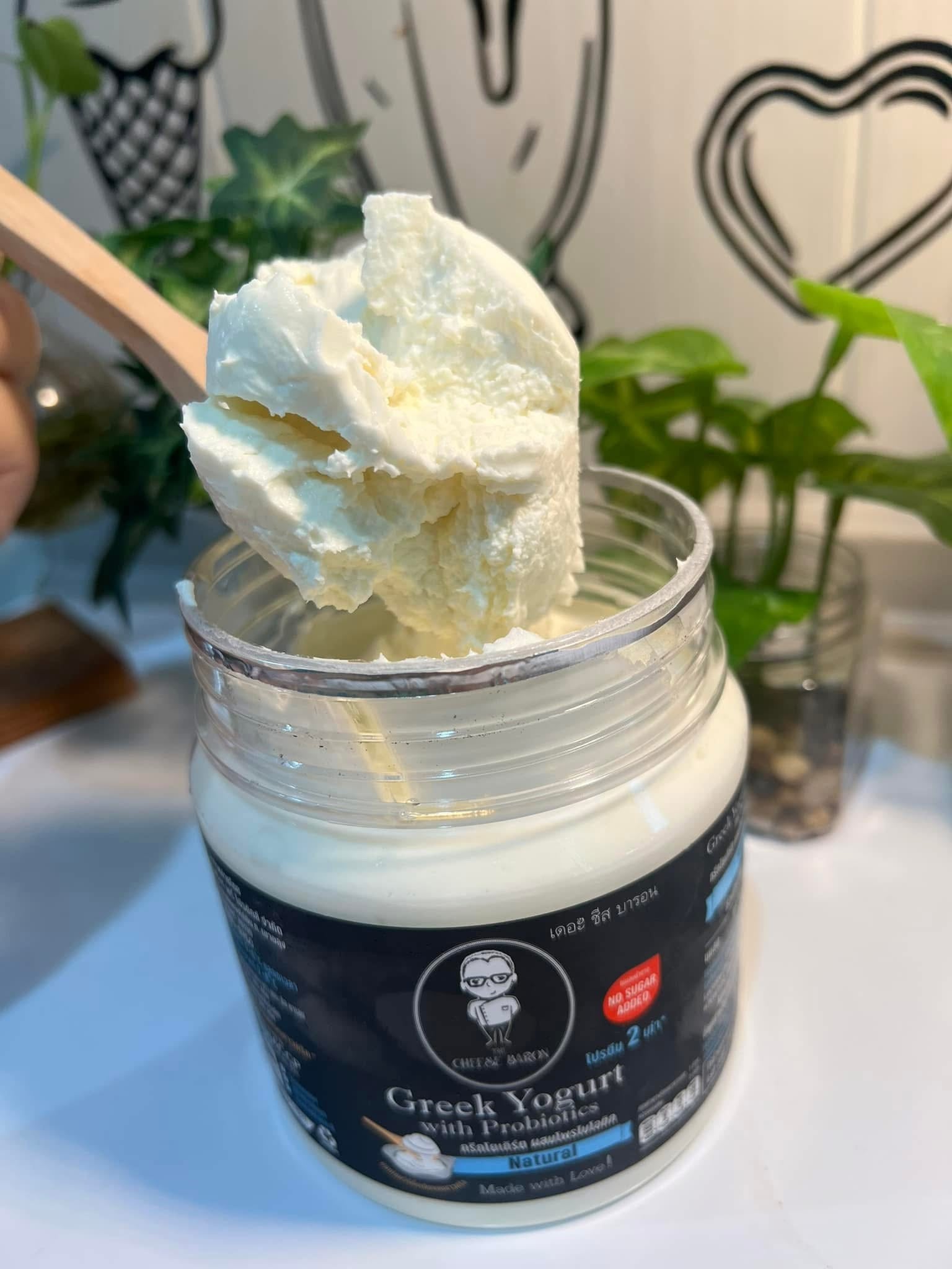 กรีกโยเกิร์ต ใช้นมสด 100% จากฟาร์มเราเอง ผสมโปรไบโอติกส์ ไม่มีส่วน